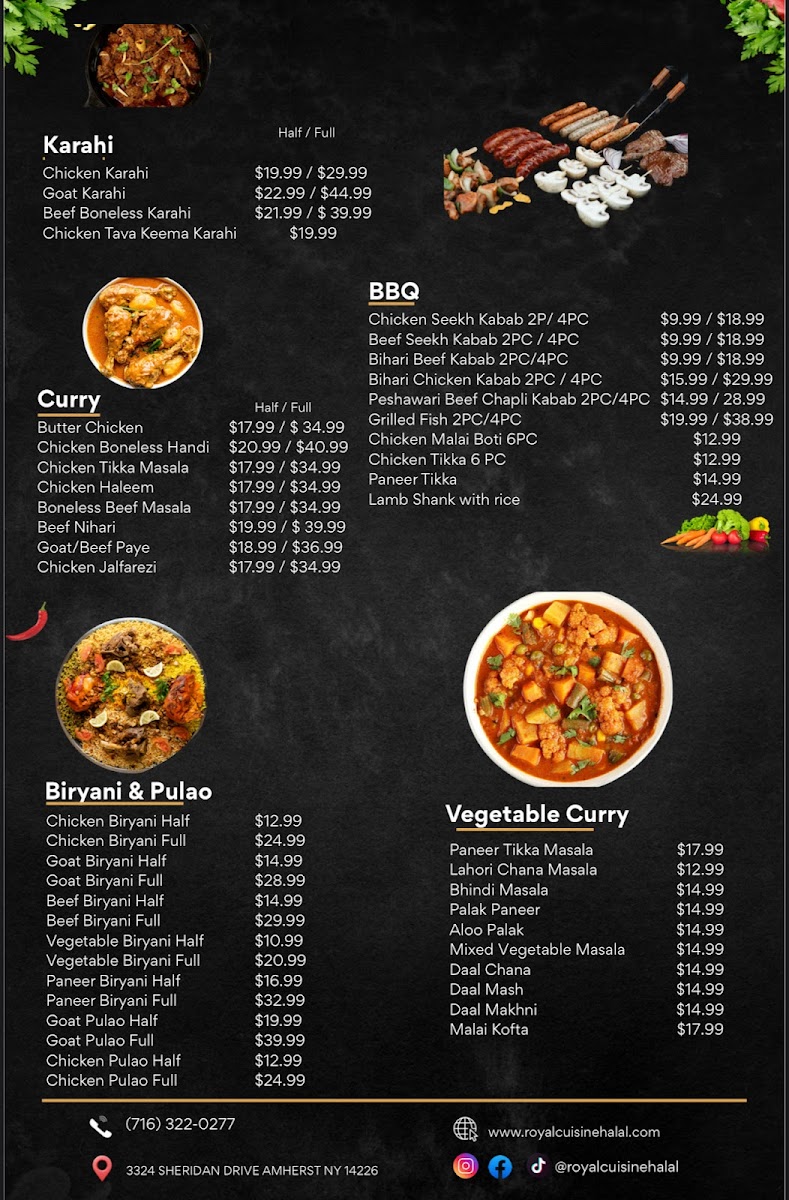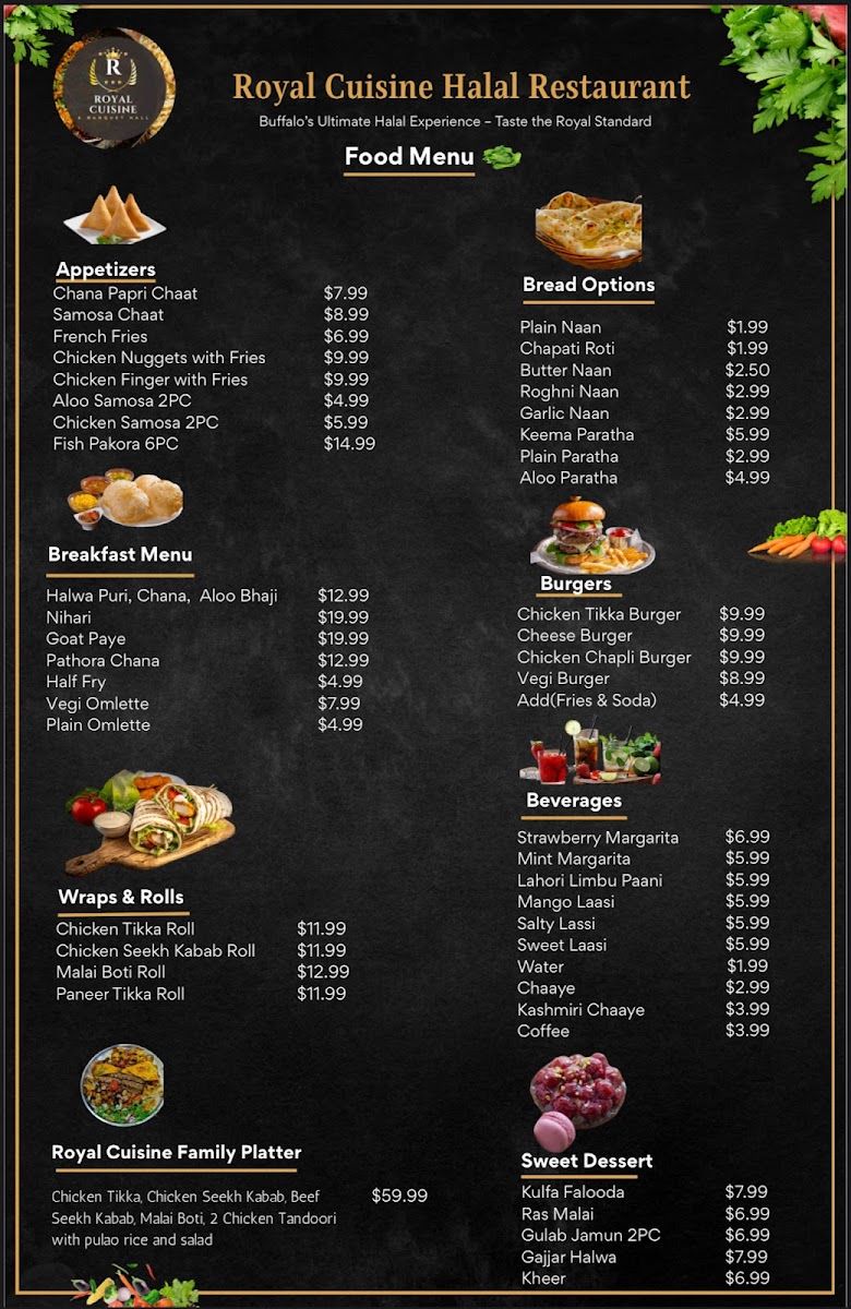 If you're in the mood for a unique and flavorful dining experience, the Royal Cuisine Halal Restaurant Menu has something special waiting for you. Located at 3324 Sheridan Dr, Amherst, NY, this cozy spot is all about bringing authentic halal flavors to the table with a royal touch. Whether you're craving a tender grilled kebab, a perfectly spiced biryani, or a delicious vegetarian option, there's plenty to choose from. Each dish is crafted with the freshest ingredients, making sure every bite is packed with flavor. And for those who enjoy a sweet finish, their desserts will leave you wanting more. It's not just a meal; it's an experience that’s perfect for any occasion.